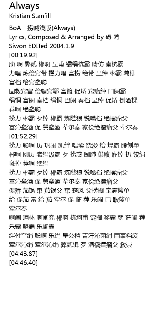 | [00:00.88] | BoA - 捞喊浅版(Always) |