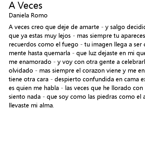 | A veces creo que deje de amarte y salgo decidida a asegurarme a veces creo que ya estas muy lejos mas siempre tu apareces en mis sue os enciendes mis recuerdos como el fuego tu imagen llega a ser como una llama penetra por mi mente hasta quemarla que luz dejaste en mi que no se apaga. a veces creo que me enamorado y voy con otra gente a celebrarlo a veces creo que ya te he olvidado mas siempre el corazon viene y me enga a descubro que ese amor tiene otra cara despierto confundida en cama extra a te llamo y el silencio es quien me habla las veces que he llorado con el alba. A veces creo que no siento nada que soy como las piedras como el agua a veces creo que tu te llevaste mi alma. |