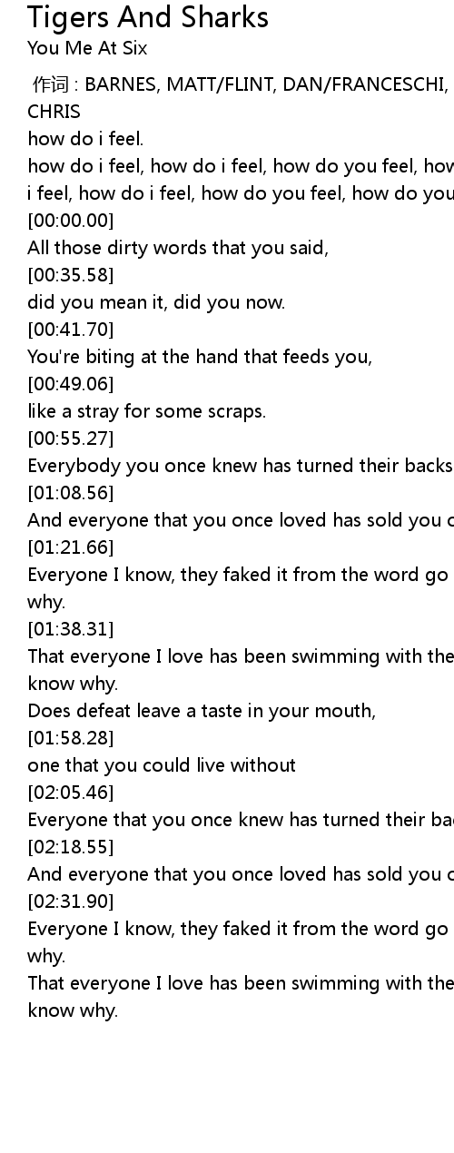 | [02:48.68] | That everyone I love has been swimming with the sharks and I don' t know why. |