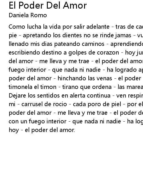 | Como lucha la vida por salir adelante tras de cada desastre siempre se pone en pie apretando los dientes no se rinde jamas vuelve a empezar un dia mas he llenado mis dias pateando caminos aprendiendo el oficio de sobrevivir escribiendo destino a golpes de corazon hoy junto a ti ma ana no el poder del amor me lleva y me trae el poder del amor gobierna mi sangre con un fuego interior que nada ni nadie ha logrado apagar ni una vez hasta hoy el poder del amor hinchando las venas el poder del amor girando las rueda timonela el timon tirano que ordena las mareas a cambios continuos hoy. Dejare los sentidos en alerta continua ven respira tranquilo dejame hacer a mi carrusel de rocio cada poro de piel por el nivel dejame hacer el poder del amor me lleva y me trae el poder del amor gobierna mi sangre con un fuego interior que nada ni nadie ha logrado apagar ni una vez hasta hoy el poder del amor. |