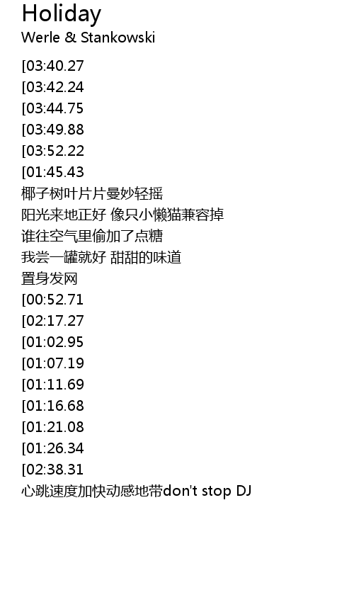 | [03:27.75][02:38.31] | 心跳加快动感地带 Holiday |