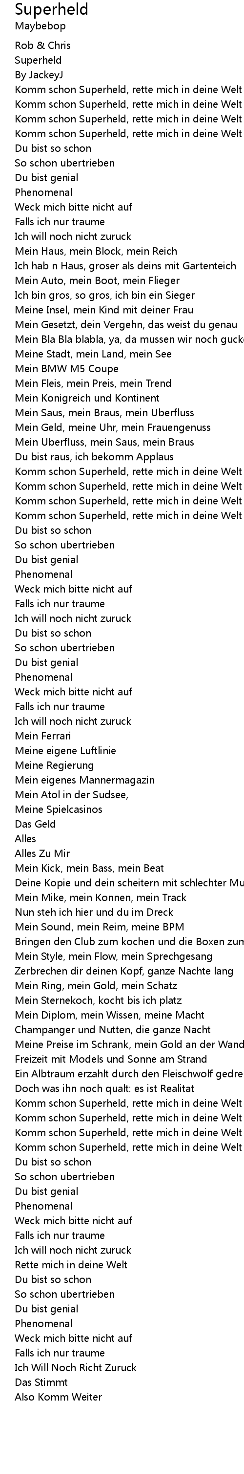 | [01:37:00] | Komm schon Superheld, rette mich in deine Welt |