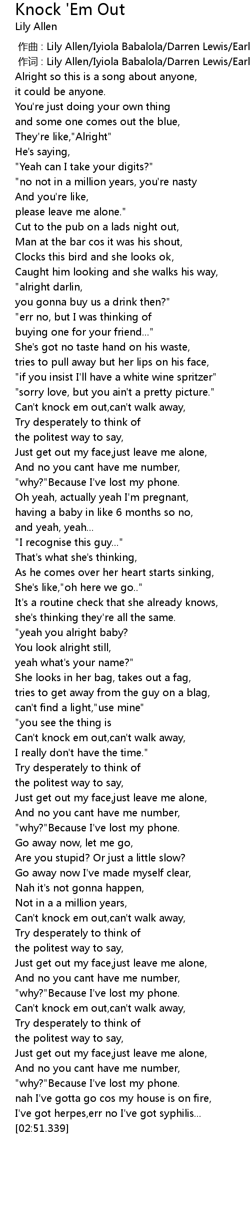 | [00:00.00] | 作曲 : Lily Allen/Iyiola Babalola/Darren Lewis/Earl King |