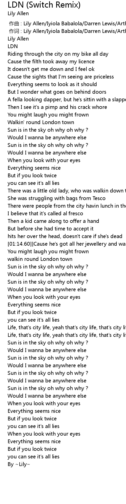 | [00:00.337] | zuò cí : Lily Allen Iyiola Babalola Darren Lewis Arthur " Duke" Reid |