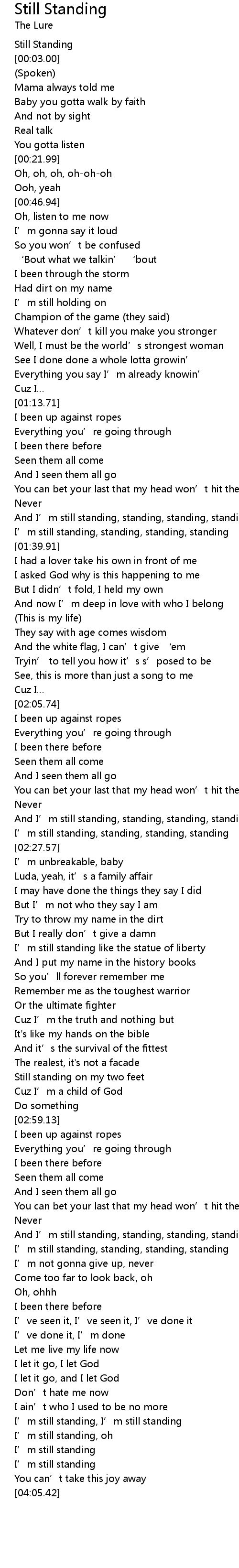 | [00:01.67] | Still Standing |