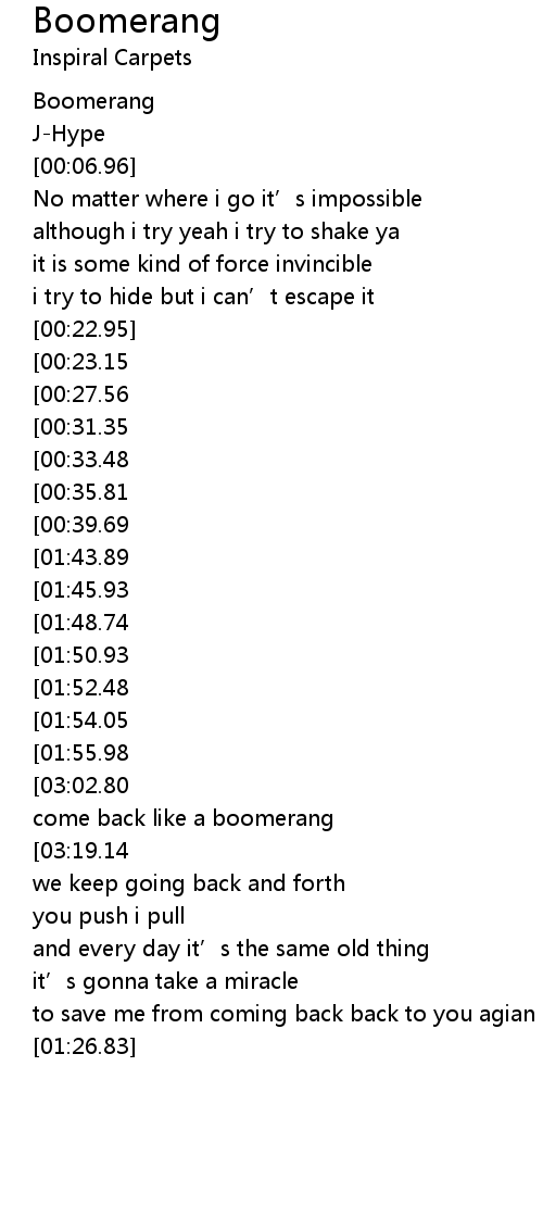 | [03:10.85][03:02.80][02:54.74][02:46.82][02:06.87][01:58.89][01:02.83][00:54.88] | i come back like a boomerang |