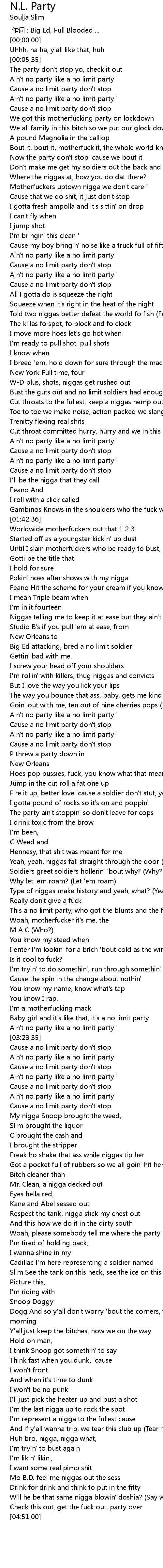 | [00:52.20] | Ain't no party like a no limit party ' |