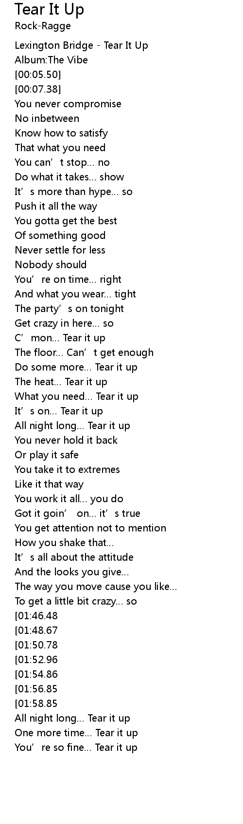 | [01:40.41][01:56.85][02:31.63][02:48.09] | What you need Tear it up |