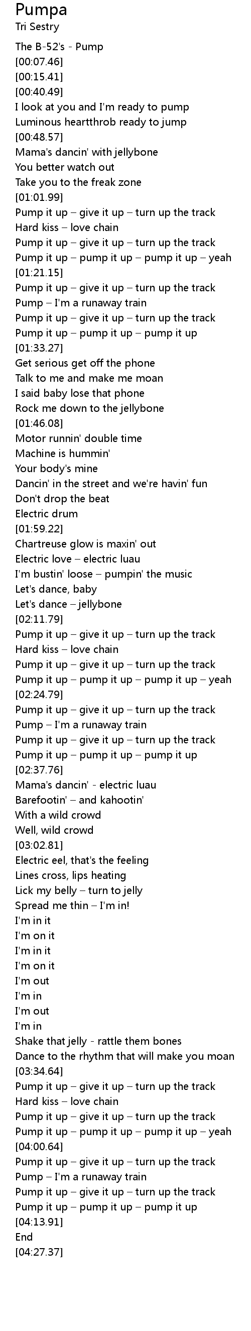 | [02:34.73] | Pump it up – pump it up – pump it up |