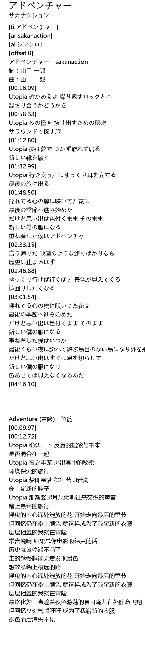 | [00:46.53] | Utopia 確かめるよ 繰り返すロックと本 |