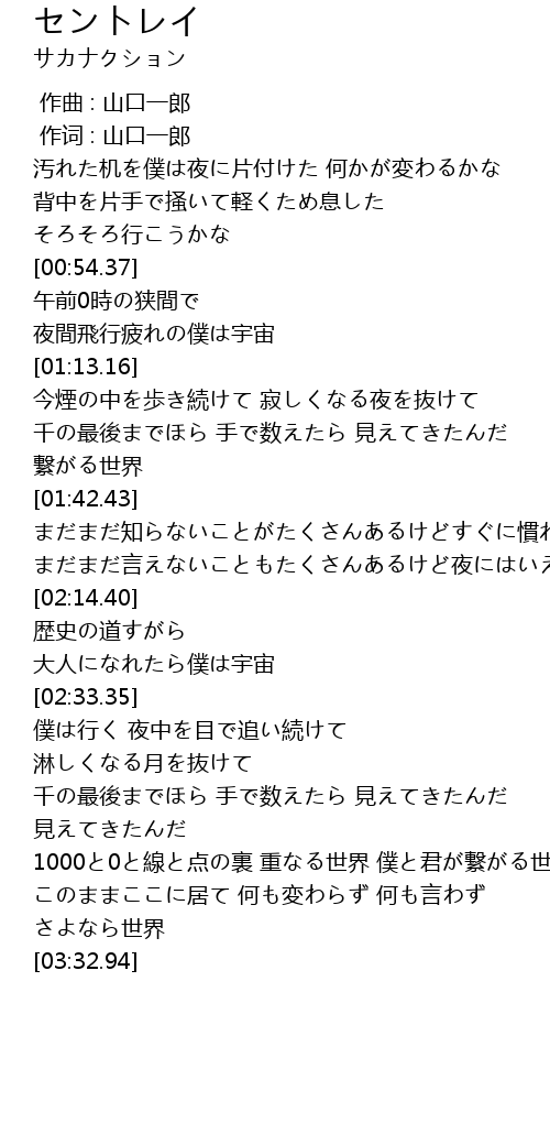 | [03:01.88] | 1000と0と線と点の裏 重なる世界 僕と君が繋がる世界 |
