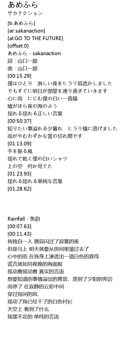 | [00:35.11] | 心に雨 にじむ僕の白い一直線 |