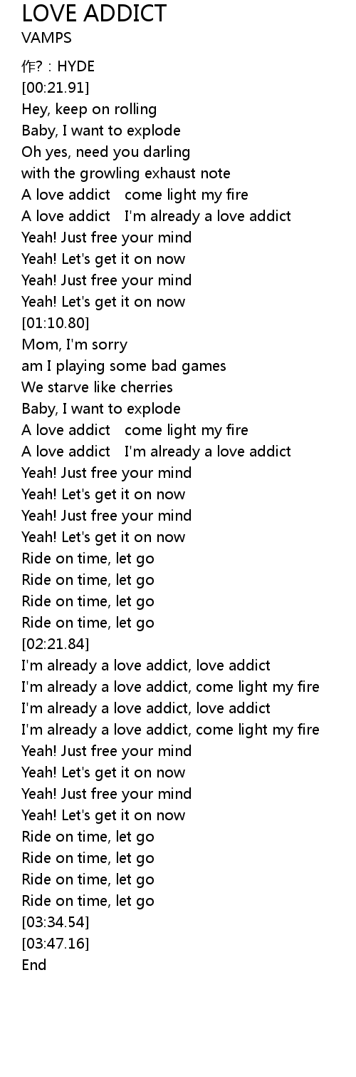 | [02:40.30] | I'm already a love addict, come light my fire |