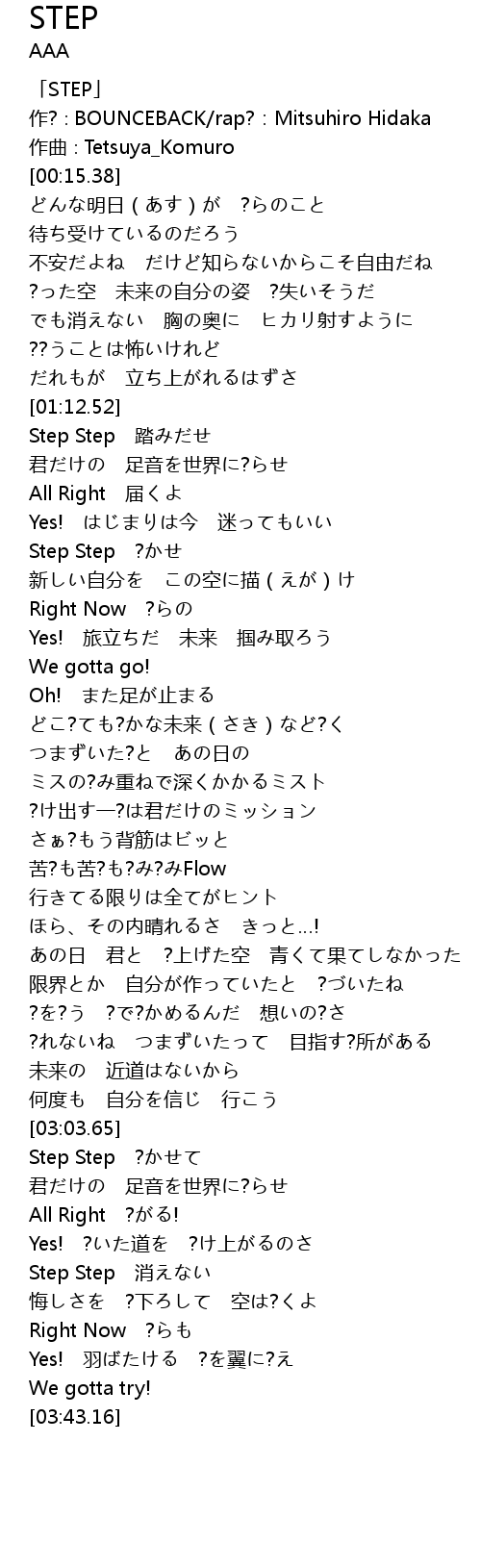 | [00:04.38] | 作?∶BOUNCEBACK/rap?:Mitsuhiro Hidaka |
