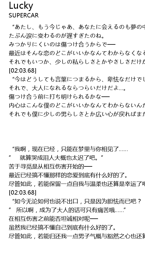 | [01:36.27] | それでもいつか、少しの私らしさとかやさしさだけが残ればまだラッキーなのにね。 |