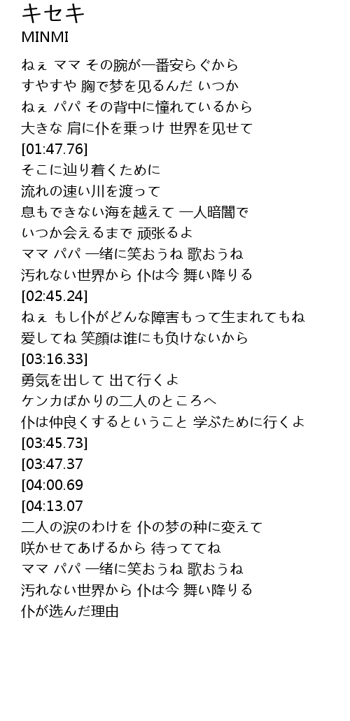 | [04:49.62][03:47.37] | ママ パパ 一绪に笑おうね 歌おうね |
