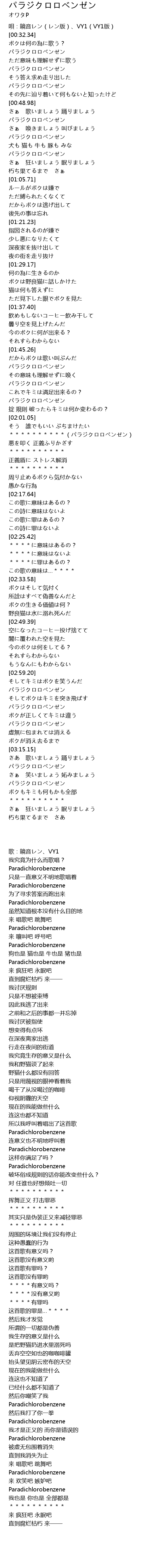 | [00:15.91] | 唄:鏡音レン(レン版)、VY1(VY1版) |