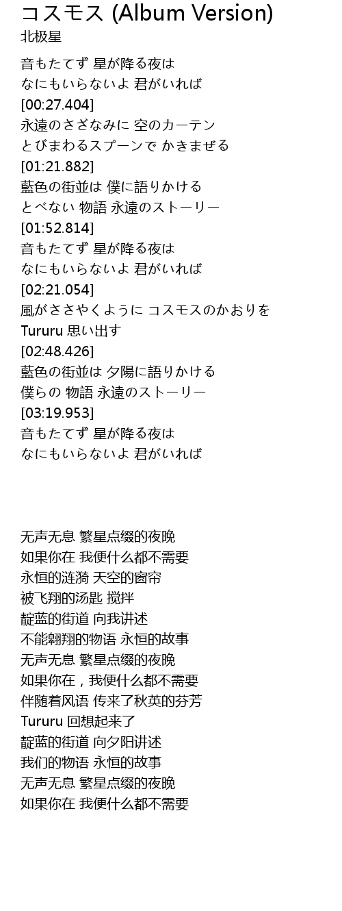 | [02:24.888] | 風がささやくように コスモスのかおりを |