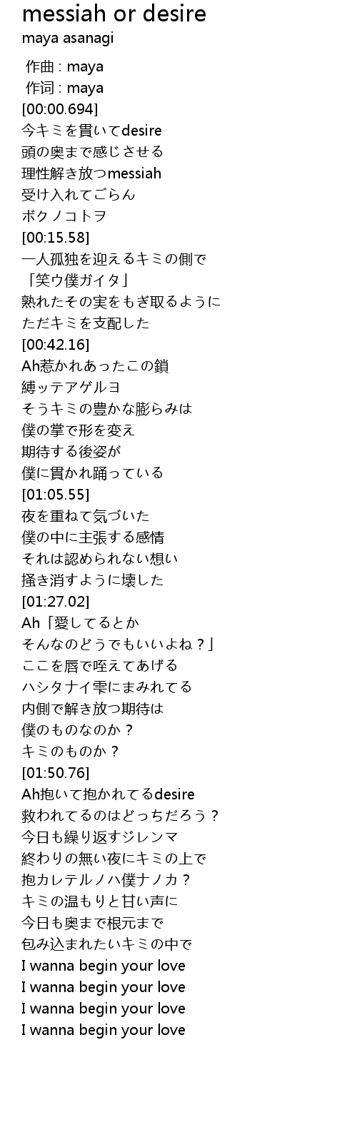 | [01:57.94] | Ah抱いて抱かれてるdesire |