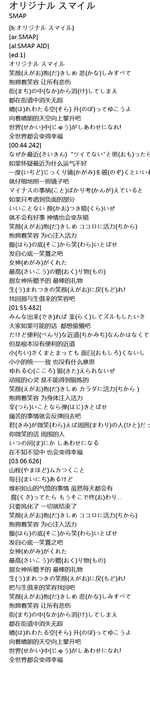 | [01:26.082] | 笑颜(えがお)抱(だ)きしめ ココロに活力(ちから) |