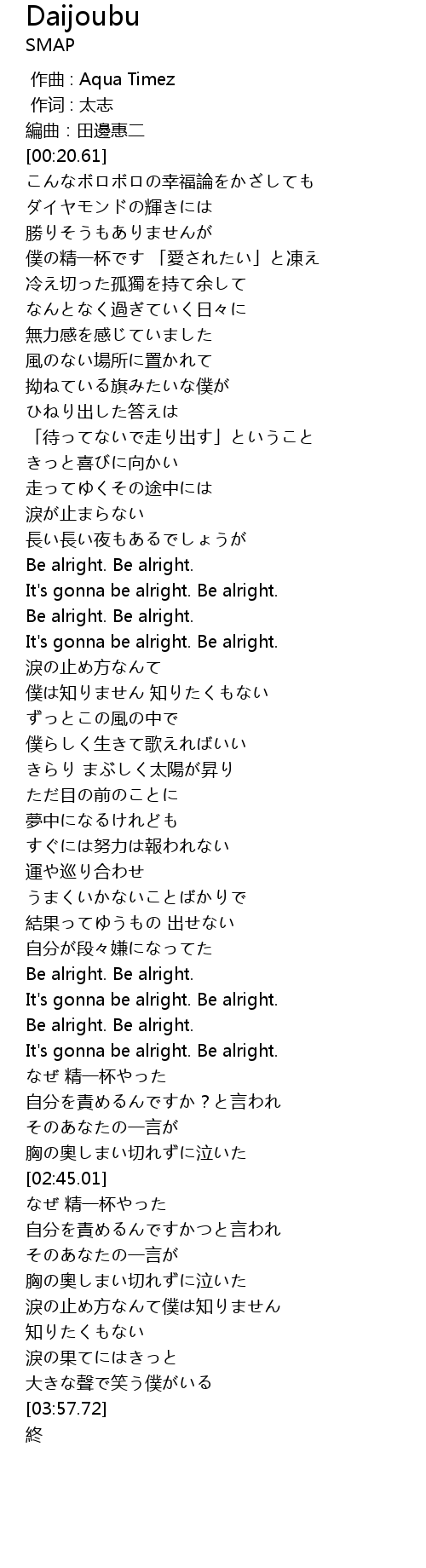 | [02:14.27] | It's gonna be alright. Be alright. |