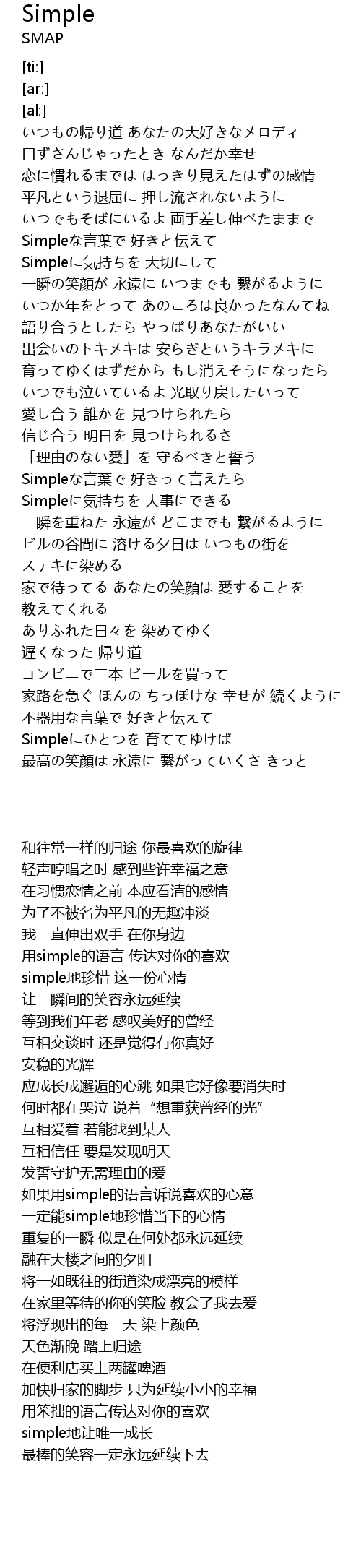 | [01:18.10] | Simpleに気持ちを 大切にして |