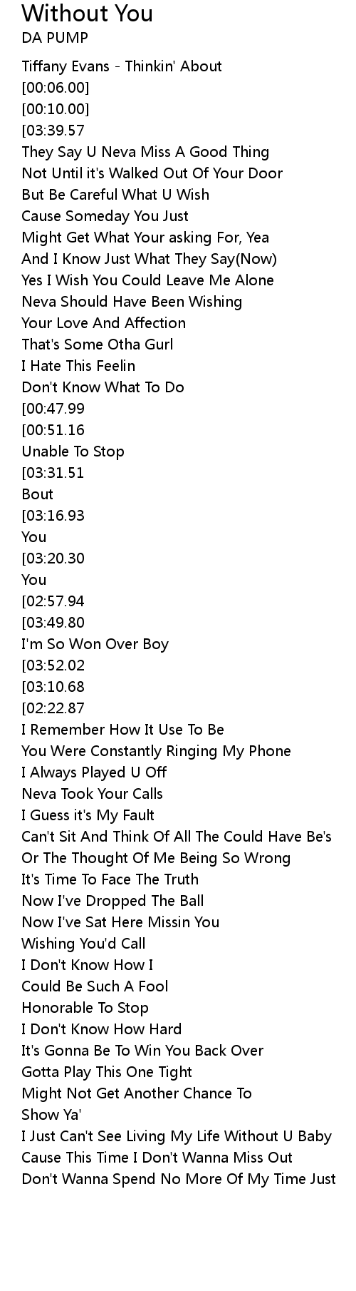 | [04:02.87][03:49.80][03:25.06][03:12.24][02:59.58][02:21.09][02:08.27][01:17.04][01:04.20] |