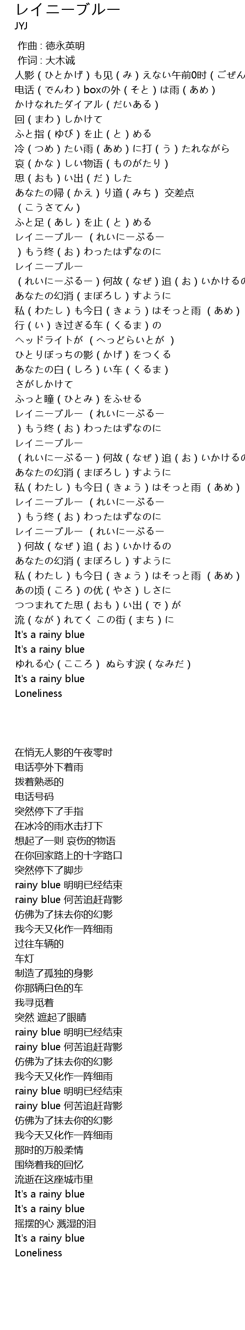 | [02:39.44] | レイニーブルー (れいにーぶるー )もう终(お)わったはずなのに |