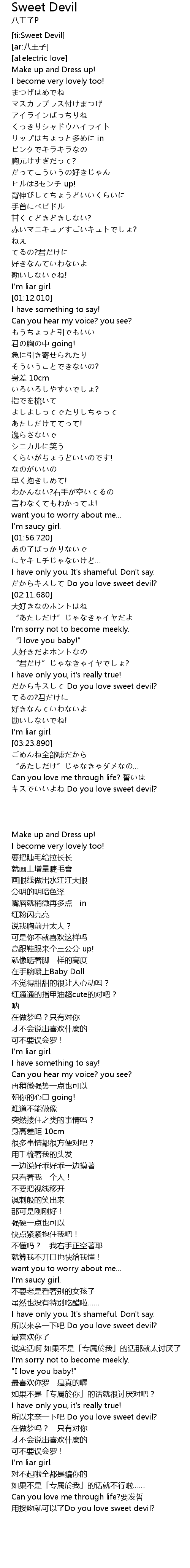 | [02:08.520] | Do you love sweet devil? |