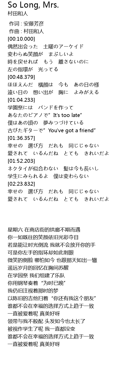 | [01:13.059] | あなたのピアノで”It's too late” |