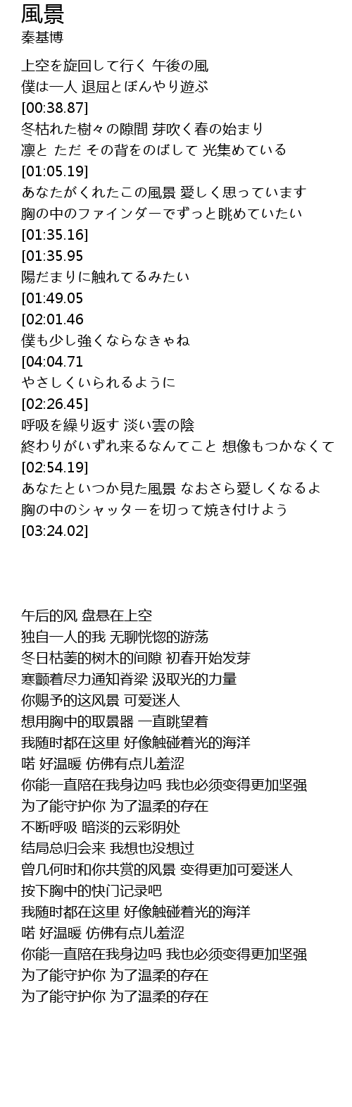 | [01:08.12] | あなたがくれたこの風景 愛しく思っています |