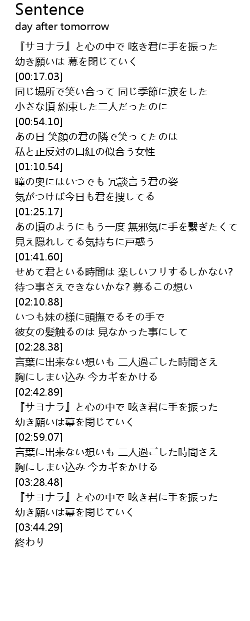 | [00:04.30] | 『サヨナラ』と心の中で 呟き君に手を振った |