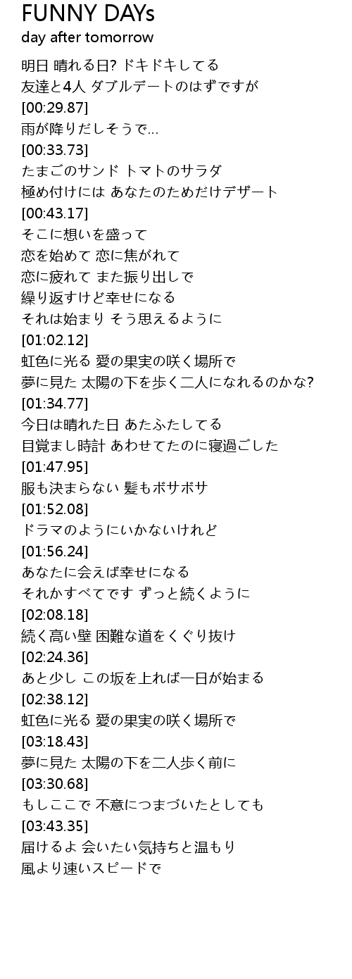 | [00:22.87] | 明日 晴れる日? ドキドキしてる |