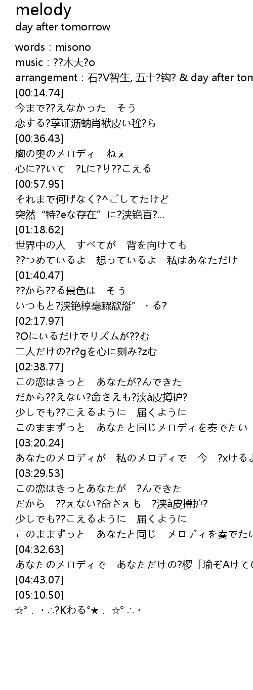 | [00:08.05] | arrangement:石?V智生, 五十?钩? & day after tomorrow |
