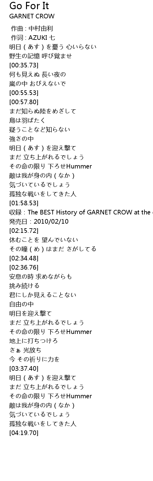 | [02:00.53] | shou lu: The BEST History of GARNET CROW at the crest CD3 |