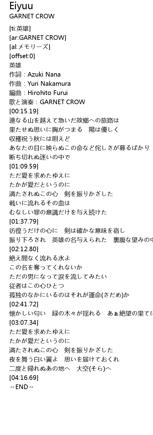 | [00:12.07] | ge yan zou: GARNET CROW |