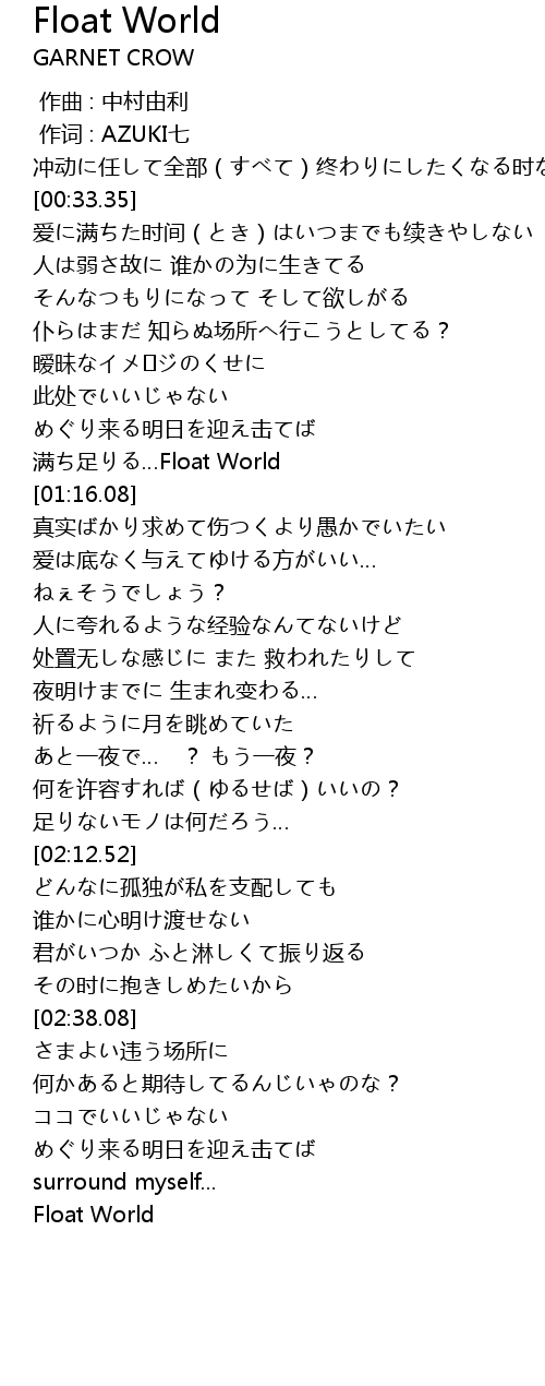 | [00:34.04] | 爱に满ちた时间(とき)はいつまでも续きやしない |