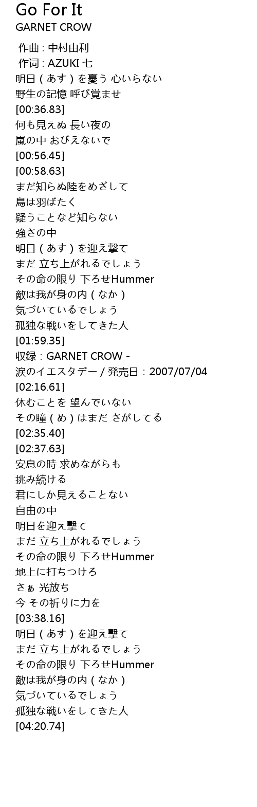 | [02:01.35] | 収録:GARNET CROW - 涙のイエスタデー/発売日:2007/07/04 |