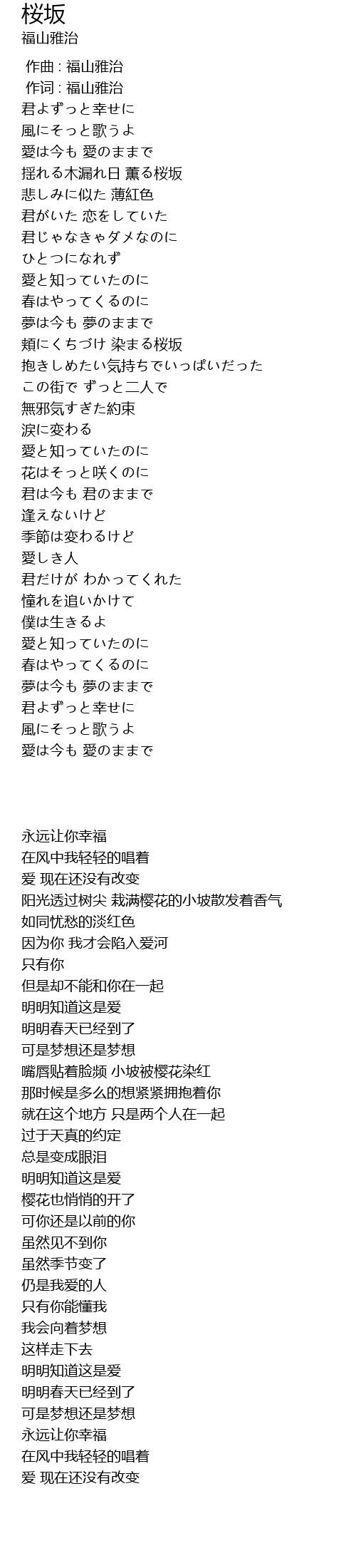 | [01:42.15] | 頬にくちづけ 染まる桜坂 |
