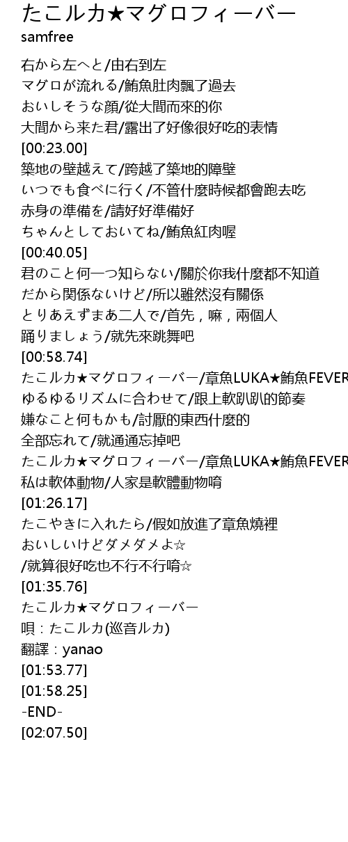 | [00:59.54] | たこルカ★マグロフィーバー/章魚LUKA★鮪魚FEVER |