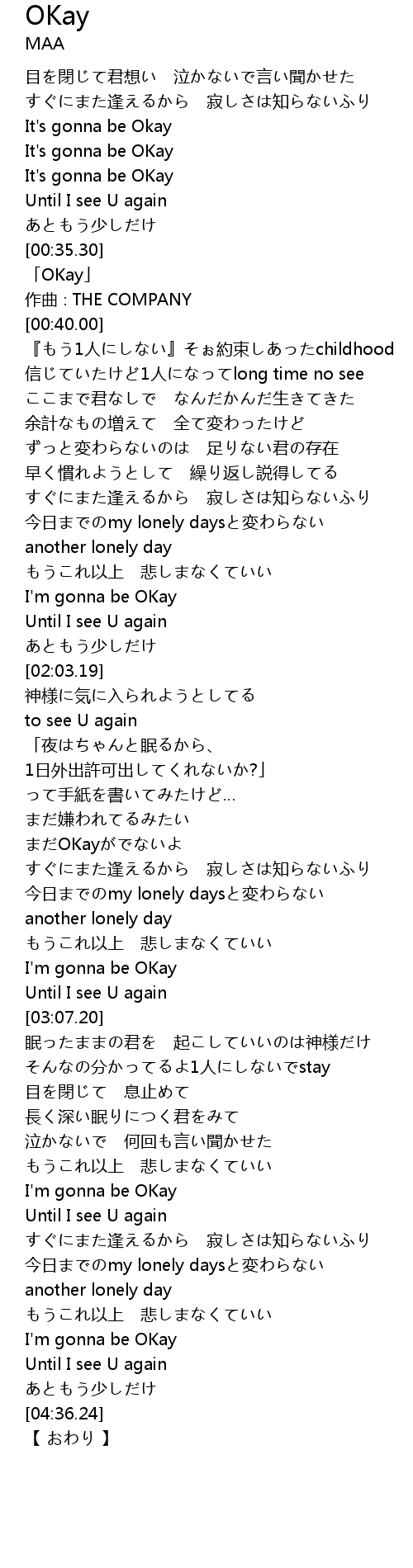 | [02:44.58] | 今日までのmy lonely daysと変わらない |