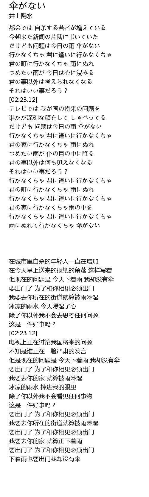 | [04:19.12] | 但是现在的问题是 今天下着雨 我却没有伞 |