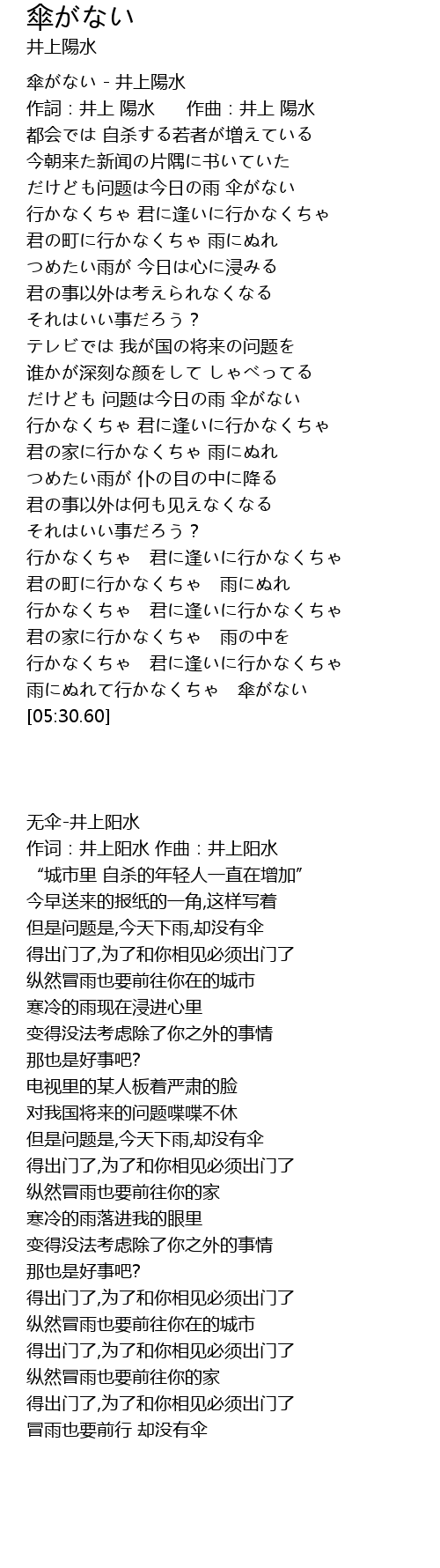 | [03:22.51] | 但是问题是,今天下雨,却没有伞 |
