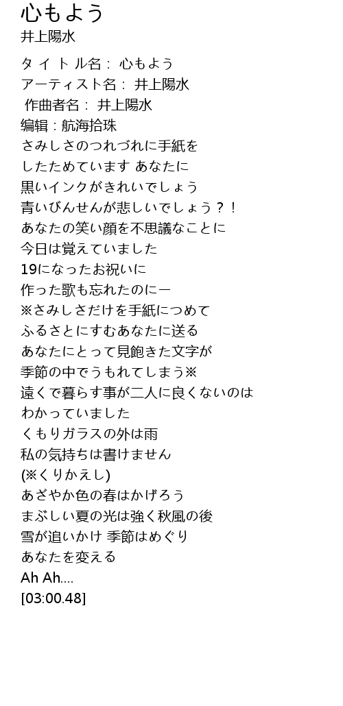 | [00:02.51] | タ イ ト ル名: 心もよう |