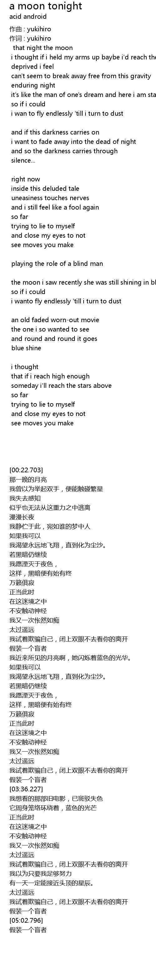 | [02:21.604] | 我近来所见的月亮啊,她闪烁着蓝色的光华。 |
