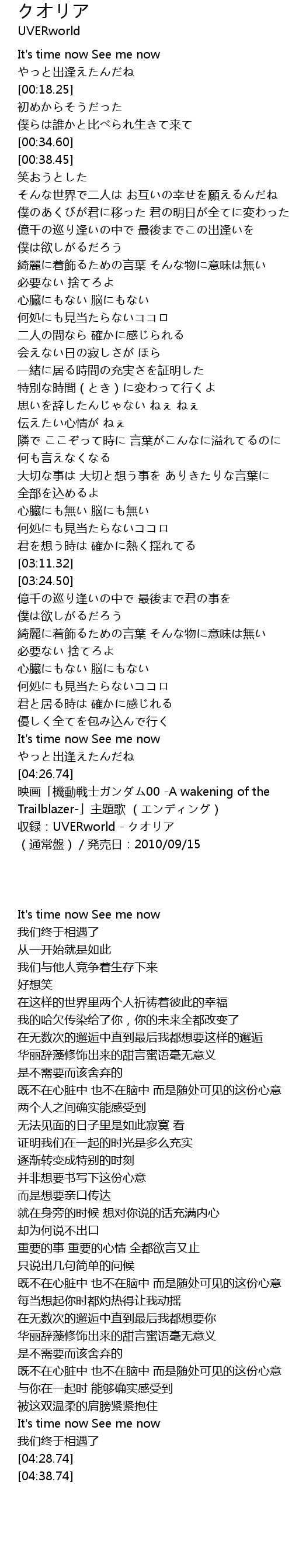 | [04:38.74] | 収録:UVERworld - クオリア (通常盤)/発売日:2010/09/15 |