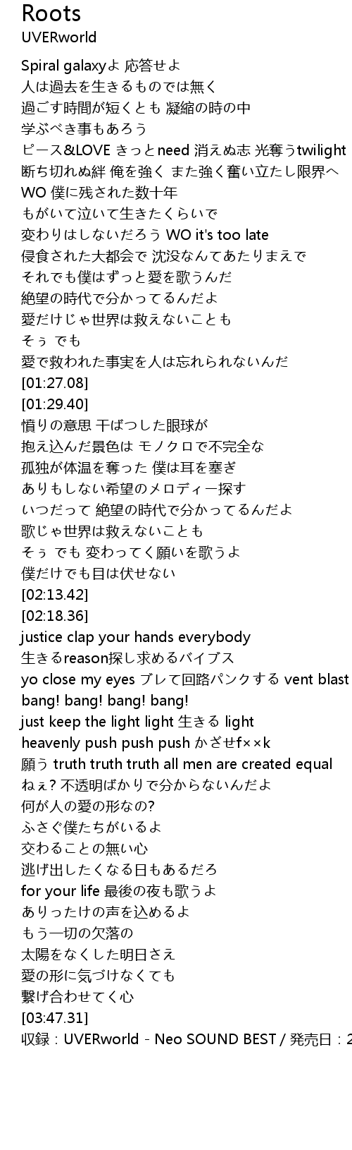 | [03:49.31] | 収録:UVERworld - Neo SOUND BEST/発売日:2009/12/09 |