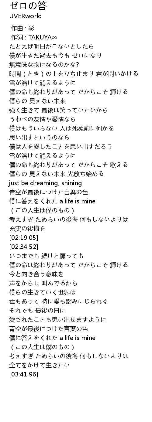 | [01:59.78] | 僕に答えをくれた a life is mine (この人生は僕のもの) |