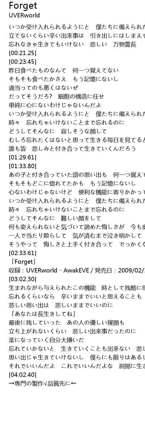 | [02:39.61] | 収録:UVERworld - AwakEVE/発売日:2009/02/18 |