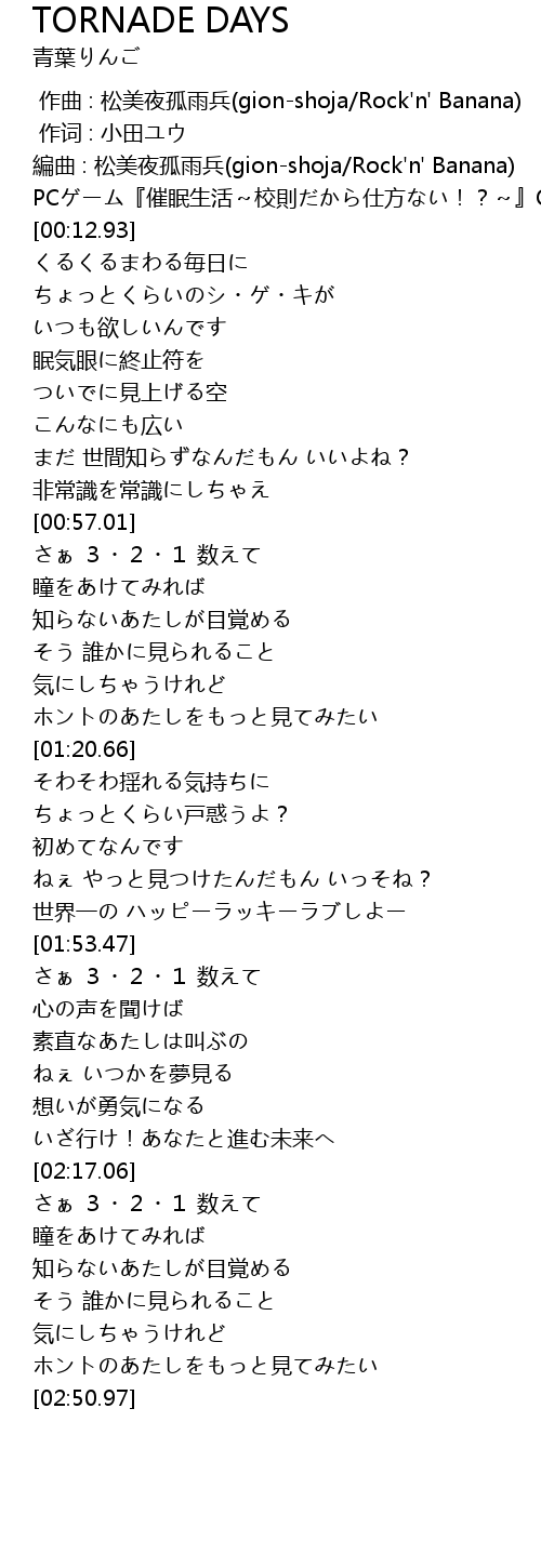 | [00:04.52] | 編曲 : 松美夜孤雨兵(gion-shoja/Rock'n' Banana) |